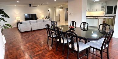 Very spacious and bright condominium for rent on Sukhumvit 39. This condo has 4 bedrooms, 4 bathrooms, a vast lounge and bar, and the dining area has a nice covered balcony. All the bedrooms are spacious and fully furnished. The kitchen is fully equipped and leads onto the maids quarters and storage area. The condo is very well decorated. The building is well maintained and offers a nice pool with a large green garden with indoor/outdoor play area for children. The location of the building is walking distance to all the many restaurants, cafes and shopping malls in that area.